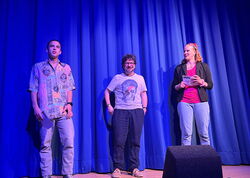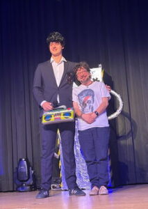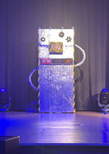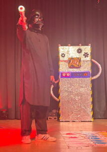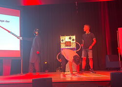 Während des Abend wurde unserem prominenten Gast durchaus viel abverlangt. Er musste sich in einem Musikquiz (Bowie und Queen) beweisen, unter anderem mit unserer Schulleiterin Cirsten Scharf vor den Augen einer fachkundigen Jury, die sich mit Gesche Eggers, Carolin Vogt und Michael Borgschulze aus den Reihen des Kollegiums formiert hatte, Yoga machen, ein Mario Kart-Rennen mit einem Bobbycar absolvieren und in einem StarWars-Quiz antreten, bei dem Sinan Hussein als strenger und unerbittlicher Darth Vader auftrat. Natürlich durften auch eine Gesangseinlage („Bochum“) und eine spontane StandUp-Comedy nicht fehlen. Zudem trat unser Gast noch gegen Lehrer Christian Fischer in einem Bierpongspiel an, wobei kein Bier getrunken wurde, sondern stattdessen vegane Marshmallows zum Einsatz kamen. Jede Aufgabe meisterte Hennes Bender mit viel Witz und Freude an der Sache.