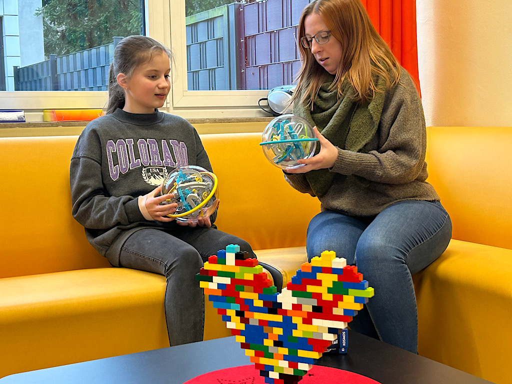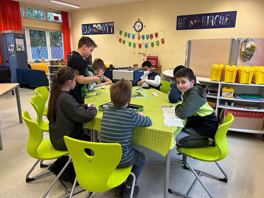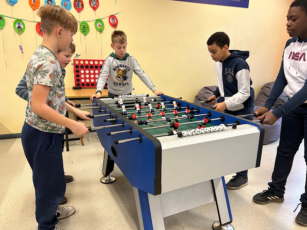 Im Anschluss beginnt der Freizeitbereich mit vielfältigen Angeboten, die den Kids nach Lust und Laune zur Verfügung stehen: saisonale, kreative Gestaltungsangebote, einfache und nachvollziehbare Geschenkideen, Legotische für Schüler:innen, Rätsel und zahlreiche Gesellschaftsspiele – nach Vorlieben auch mal eine Runde Kickern oder Air-Hockey.